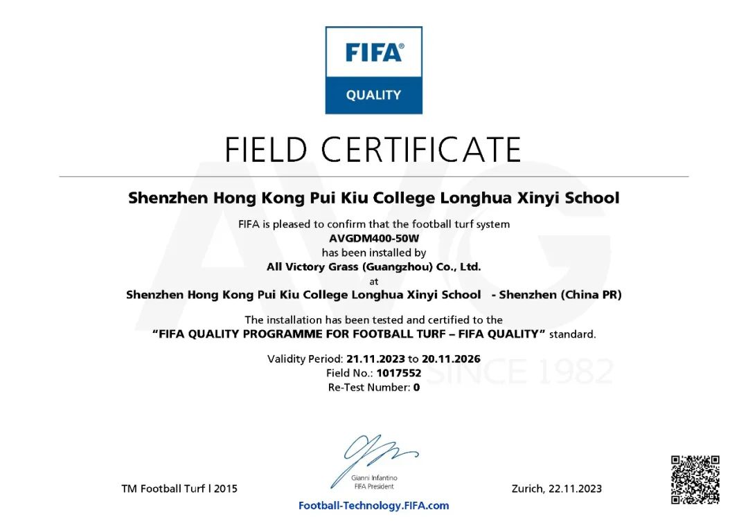 Ngày ??ng: 25-11-2023(AVG) Vào ngày 22 tháng 11, san bóng c?a Shenzhen Hong Kong Pui Kiu College Longhua Xinyi School (PKXYS) ?? v??t qua m?t cách thu?n l?i vòng ki?m tra ch?t l??ng b? m?t san c?, và ???c Liên ?oàn bóng ?á th? gi?i c?p Ch?ng ch? san bóng ??t chu?n FIFA.