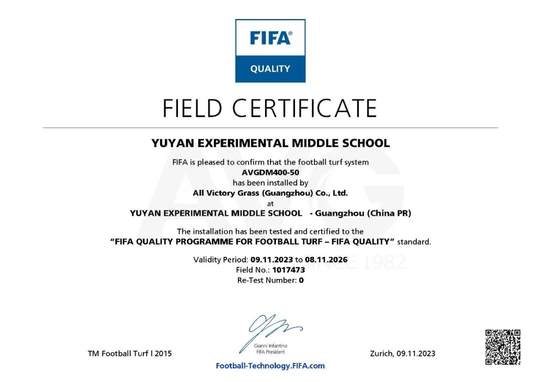 Trong s? ?ó, c?m 2 san bóng?s??A1, A2 c?a C?ng viên th? thao sinh thái ven bi?n Phúc ?i?n (Futian)?Tham Quy?n ?? giành ???c?Ch?ng ch? san bóng ??t chu?n FIFA ? c?p ?? cao nh?t và ???c c?p?ch?ng nh?n FIFA QUALITY PRO. San bóng c?a Tr??ng Th?c nghi?m Yuyan ? qu?n Hoàng Ph?, thành ph? Qu?ng Chau c?ng ??????c?c?p?ch?ng nh?n FIFA QUALITY.
